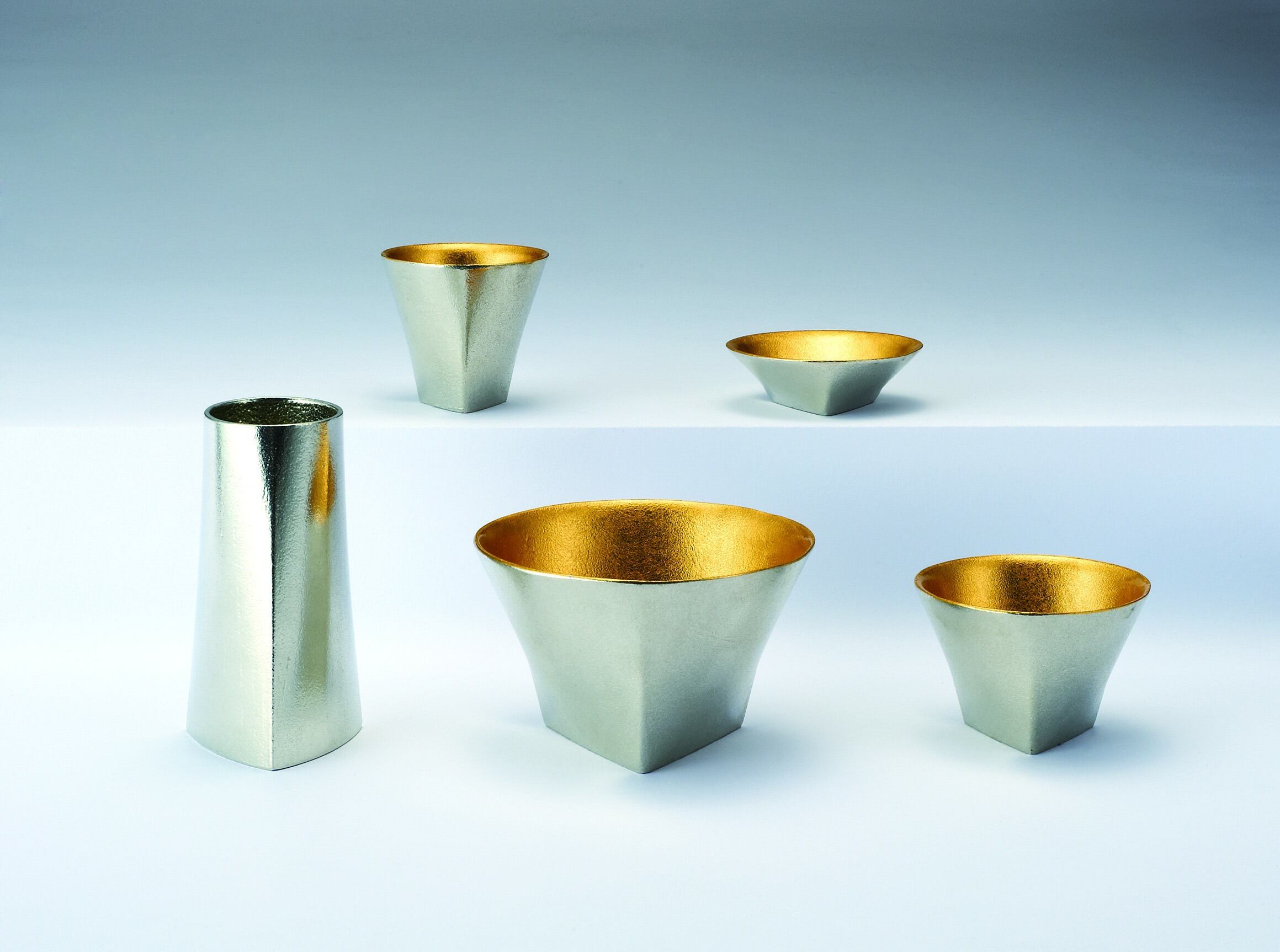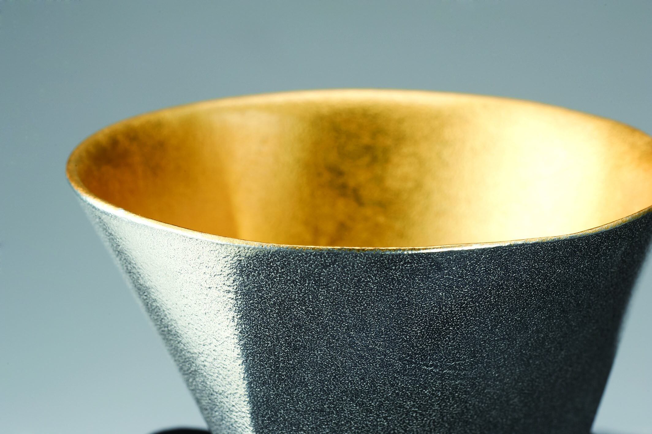 錫 100%の無垢と金箔を華やかに合わせました。三角から円に変形していく形が個性的です。